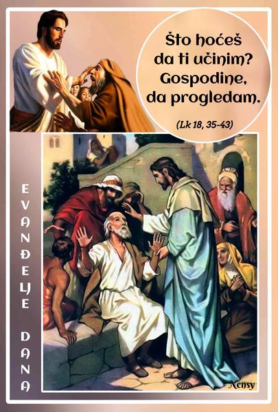 Isus se zaustavi i zapovjedi da ga dovedu k njemu. Kad se on približi, upita ga: »Što hoćeš da ti učinim?« A on će: »Gospodine, da progledam.« Isus će mu: »Progledaj! Vjera te tvoja spasila.« I umah progleda i uputi se za njim slaveći Boga. I sav narod koji to vidje dade hvalu Bogu.