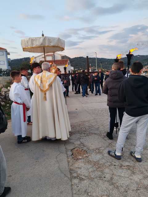 Danas u središtu naše vjerničke pozornosti, drugoga dana Vazmenog trodnevlja, stojimo pred križem koji sam Bog stavlja pred nas da ga dotaknemo, da ga poljubimo, da mu se poklonimo. Stojimo pred križem spominjući se kako je na drvetu križa izvršena smrtna osuda nad Božjim Sinom, kako smo slušali u izviješću iz Muke po Ivanu: “Uzeše dakle Isusa. I noseći svoj križ, iziđe on na mjesto zvano Lubanjsko, hebrejski Golgota. Ondje ga razapeše, a s njim i drugu dvojicu, s jedne i druge strane, a Isusa u sredini.” Zato je u obredima Velikoga petka križ u središtu pozornosti i čašćenja, jer je ovaj događaj bio ciljna točka prema kojoj je Isus bio usmjerio svu svoju pozornost i svu svoju mesijansku djelatnost. Doista, svjesno je išao prema trenutku u kojem će položiti život na križu, kako bi svojom krvlju zapečatio svoje propovijedanje, te dao snagu blagovanju pashalne večere. Zato je i večeras u obredima Velikoga petka sveti križ Gospodinov u sredini između slušanja njegove riječi, te obreda pričesti u kojem primamo njegovo tijelo predano za nas i naše spasenje. Jer božanska mudrost koja je izlazila iz njegovih usta nije ostala samo na riječi, već je potvrđena svetim znamenom njegove krvi, a kruh i vino nisu ostali samo zemaljski prinosni darovi, već su primili njegovu muku i smrt, ali i snagu uskrsnuća, čemu je križ trajni znak i spomen.