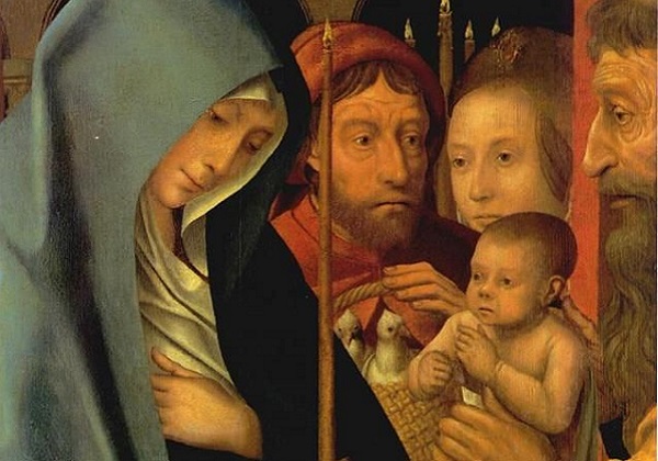 Roditelji dolaze u Hram radi čišćenja majke – jer rođenje djeteta čini majku nečistom i zbog toga se ona mora očistiti prinoseći žrtvu – ovdje žrtvu siromašnih – dvije grlice  – te napose da bi platili otkupninu za sina.